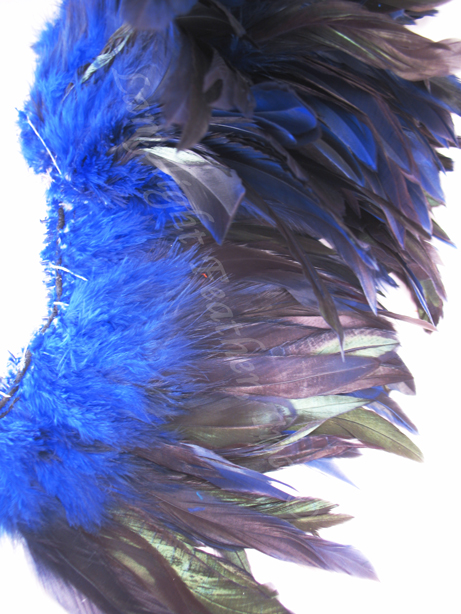Free Shipping for USA orders over $25. Blue Half Bronze Schlappen Rooster Feathers 6-7 Inch per Ounce Schlappen is a type of rooster feather located at the base of the tail. The feathers are soft and flexible but wider and denser than Saddle. The stem is thinner than coque. This gorgeous Schlappen is originally a natural brown with iridescent bronze-black highlights that is dyed with a brighter color. It is a densely sewn together and easy to apply as is with numerous applications in millinery, earrings, fashion, costume design, crafts, dance outfits, masks, Carnival and Tahitian dance costumes. The feathers can be pulled off and used individually or in clumps or a shorter piece can be cut off without the string unraveling. This half bronze schlappen is 5-7 inches in length with over 250 feathers per strung ounce. An ounce measures about 16-18 inches (35 cm) along the sewn end. Price is per strung ounce