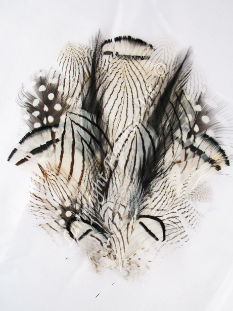 Free Shipping for USA orders over $25. Feather Pad, GUINEA Pheasant hackle MIX, per EACH These Feather Pad s are a mixture of natural pheasant, guinea, and rooster hackle feathers glued onto a material backing. This pad compliments our Black and White trim of the same feathers. These quality Feather Pad s are quite often used by the millinery industry. They are also suitable for trimmings and applique on just about anything from lamp shades to place mats. Each pad measure approximately. 4" x 5". Price is per each.