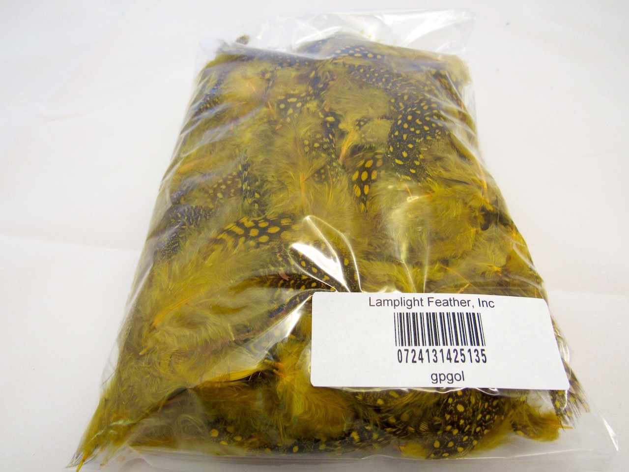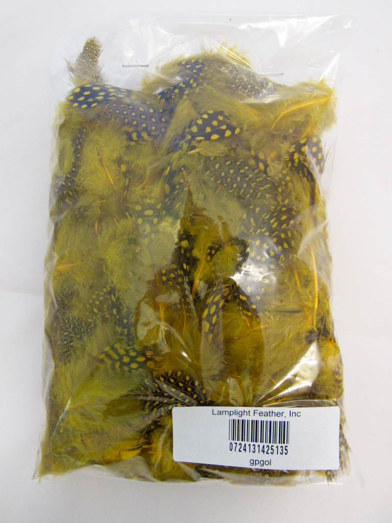 Free Shipping for USA orders over $25. Guinea Plumage Craft feathers Craft feathers GOLD per ounce SKU: gpgol This decorative loose GUINEA PLUMAGE has MIXED spotted and speckled feathers dyed gold. The feathers are about 1-4 inches long with over 200 feathers per ounce. This item is available in larger quantities. Please call for pricing.