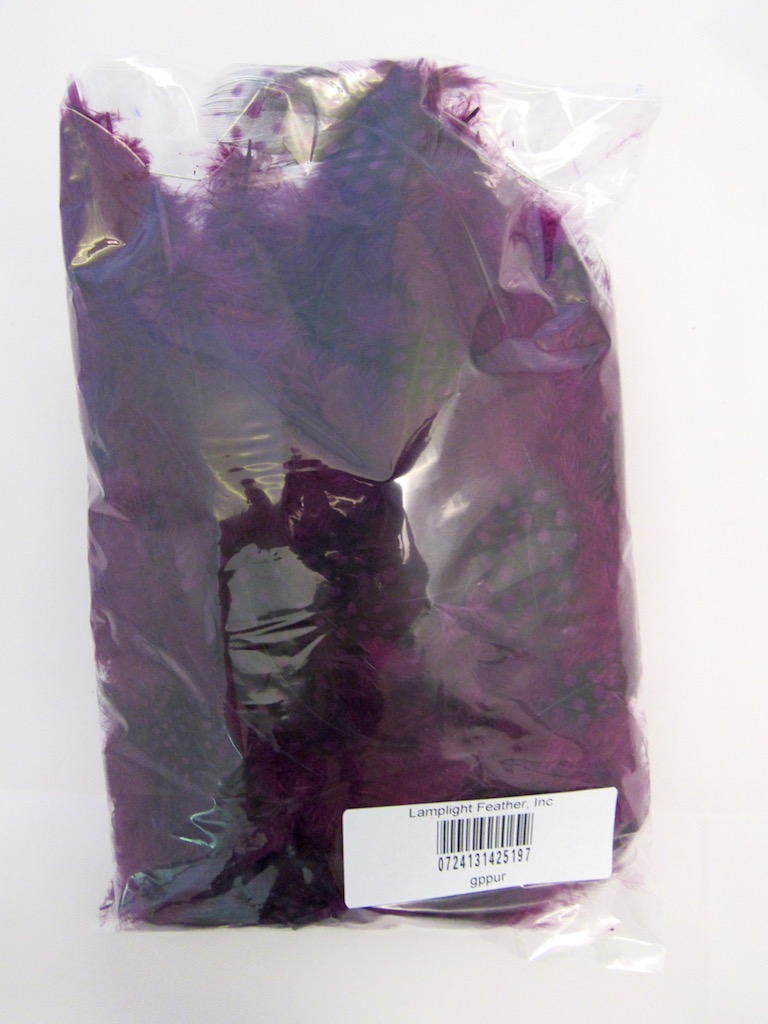 Free Shipping for USA orders over $25. Guinea Plumage Craft Feather Purple per ounce SKU: gppur This decorative loose GUINEA PLUMAGE has MIXED spotted and speckled feathers dyed Purple. The feathers are about 1-4 inches long with over 200 feathers per ounce. This item is available in larger quantities. Please call for pricing.