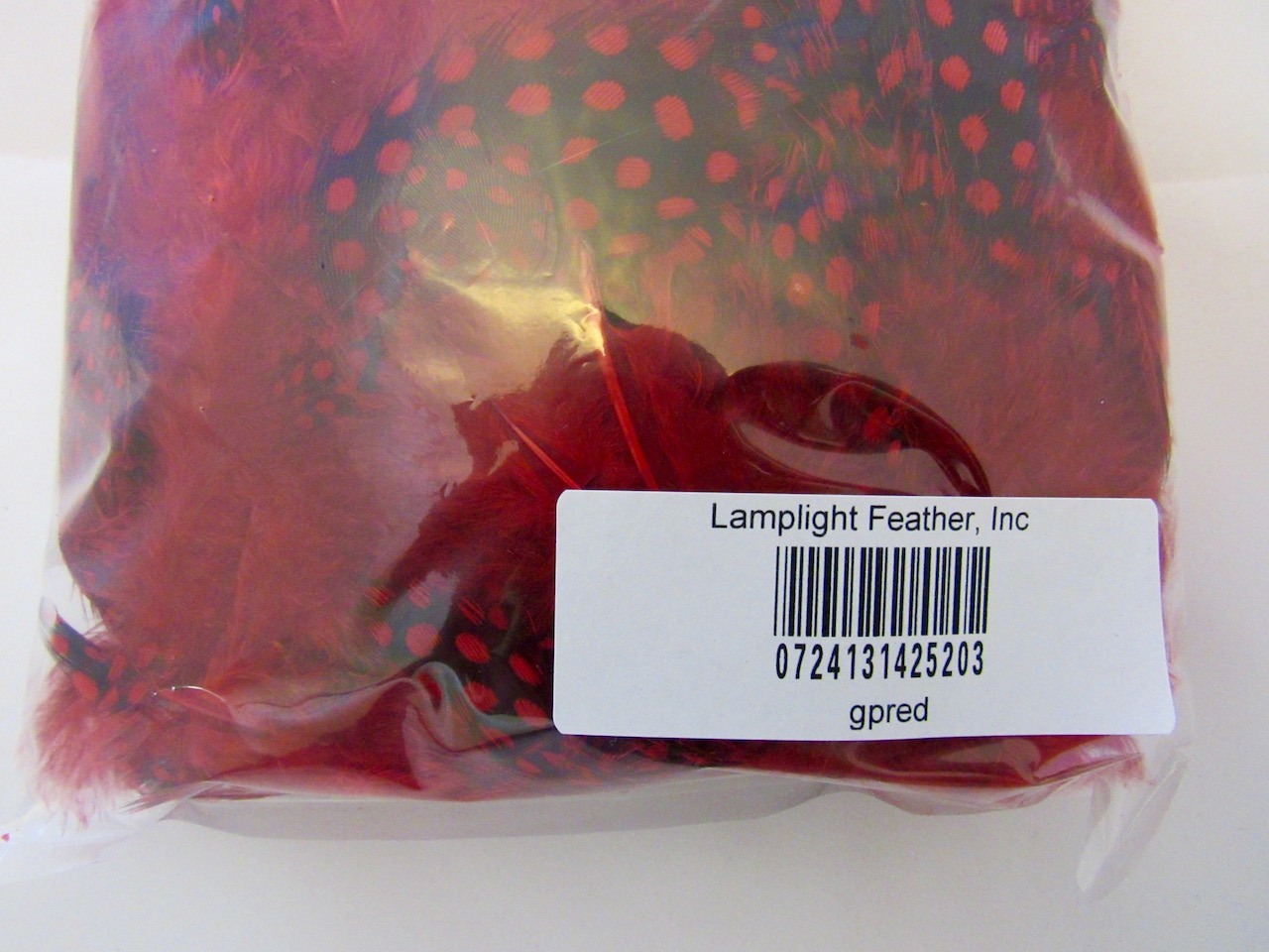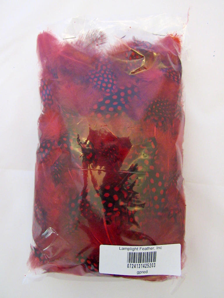 Free Shipping for USA orders over $25. Guinea Plumage Craft Feathers Red per ounce These red decorative looseGuinea Plumage feathers have MIXED spotted and speckled feathers dyed red. The feathers are about 1-4 inches long with over 200 feathers per ounce. Price is per ounce (28 gram)