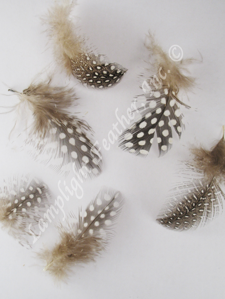 Free Shipping for USA orders over $25. Guinea Plumage Craft Feather, strung, NATURAL MIXED , per foot .SKU: gpmix This decorative strung plumage, has MIXED spotted, and speckled feathers. The feathers are between 2-4 inches in length with over 250 feathers per foot of strung length. Price is per strung foot.