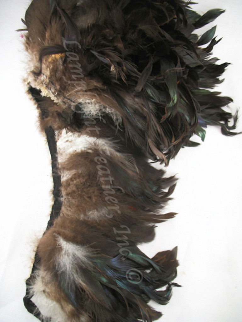 This feather trim is natural bronze black hackle for a beautiful effect. Strung rooster hackle comes on a black bias tape ready to apply. Hackle feather trim is thin stemmed, very flexible with lots of movement, and with generous amounts of fluff at the base. The feathers range in length from 4-6" inches with over 600 feathers per yard. This is a particularly gorgeous hackle trim that is hard to find these days but at a bargain price more than 30% off retail.