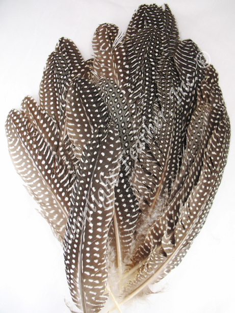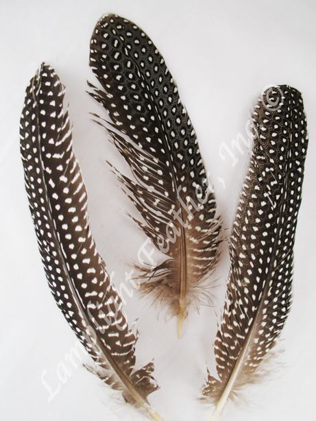 Free Shipping for USA orders over $25. Guinea Feathers Wing Quills Natural 6-8 Inch per 25 This item is a package of 25 Guinea Fowl wing feathers. The feathers have a dramatic speckled and spotted pattern and are 6-8 inches. They take a dye quite well with the white spots absorbing the dye to a nice effect. Price is for 25 feathers
