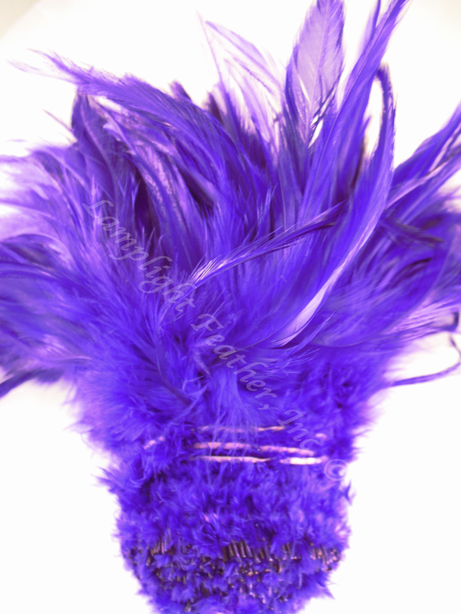 Free Shipping for USA orders over $25. Purple Saddle Long 5-7 inch per Ounce This strung (double stitched) rooster saddle feathers is dyed over natural white.Saddle hackle feathers are thin stemmed and very flexible with a lot of movement. Lots of fluff at the base of each feather and the feathers rise to a narrow tip. The material is densely sewn with over 150 feathers per half ounce. The feathers measure 5-7 inches in length. An half ounce of this material measures about 7-8 inches (20 cm) along the linear (sewn) end. The price is per half ounce